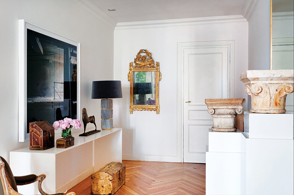 {I love the contrast of the sleek console table, striking, large-scaled photograph, and marble lamp against the cornices atop pedestals and the gilded mirror next to the front door. Upon researching Luis Puerta, I found out that his bachelors’ degree is in the study of Art and Antiquities. Needless to say, his passion shines through his work.